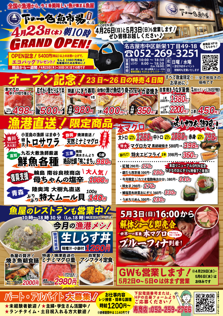 【下の一色魚市場本店】4月23日OPEN!オープン記念特売4日間開催!